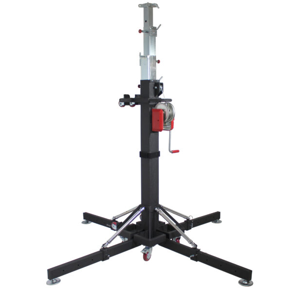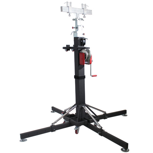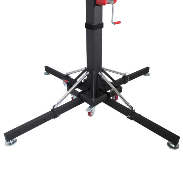 It folds easily to a portable size for transport. It’s equipped with a smooth, heavy-duty cranking mechanism. Perfect for a live band and mobile DJ applications, eliminate direct lifting and lowering of heavy loads.