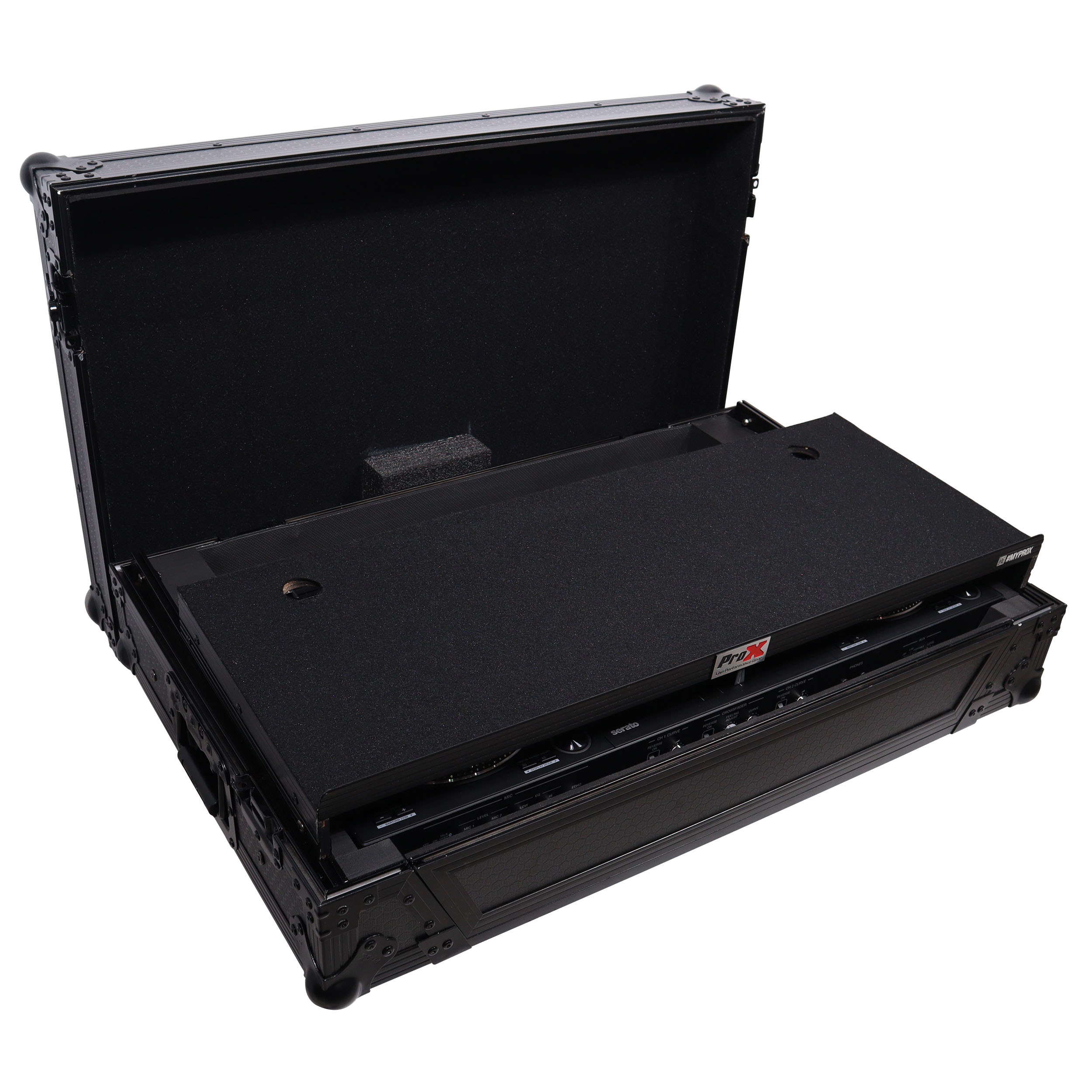 ProX Gig-Ready™ Series cases are constructed from rugged 3/8″ Plywood, reinforced with steel ball corners, spring-loaded recessed padded handles, and twist-locking latches. There is additional space for cables and small accessories at the rear underneath the controller for convenience. The removable front panel allows for easy access to the DJ controller front control knobs, headphones, mic jacks, etc.
